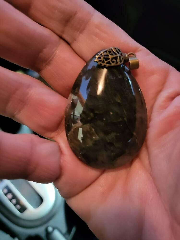 This Labradorite pendant is one of a kind, it was handcut from a raw piece of labradorite and polished to reveal it's beautifill flashing patterns.