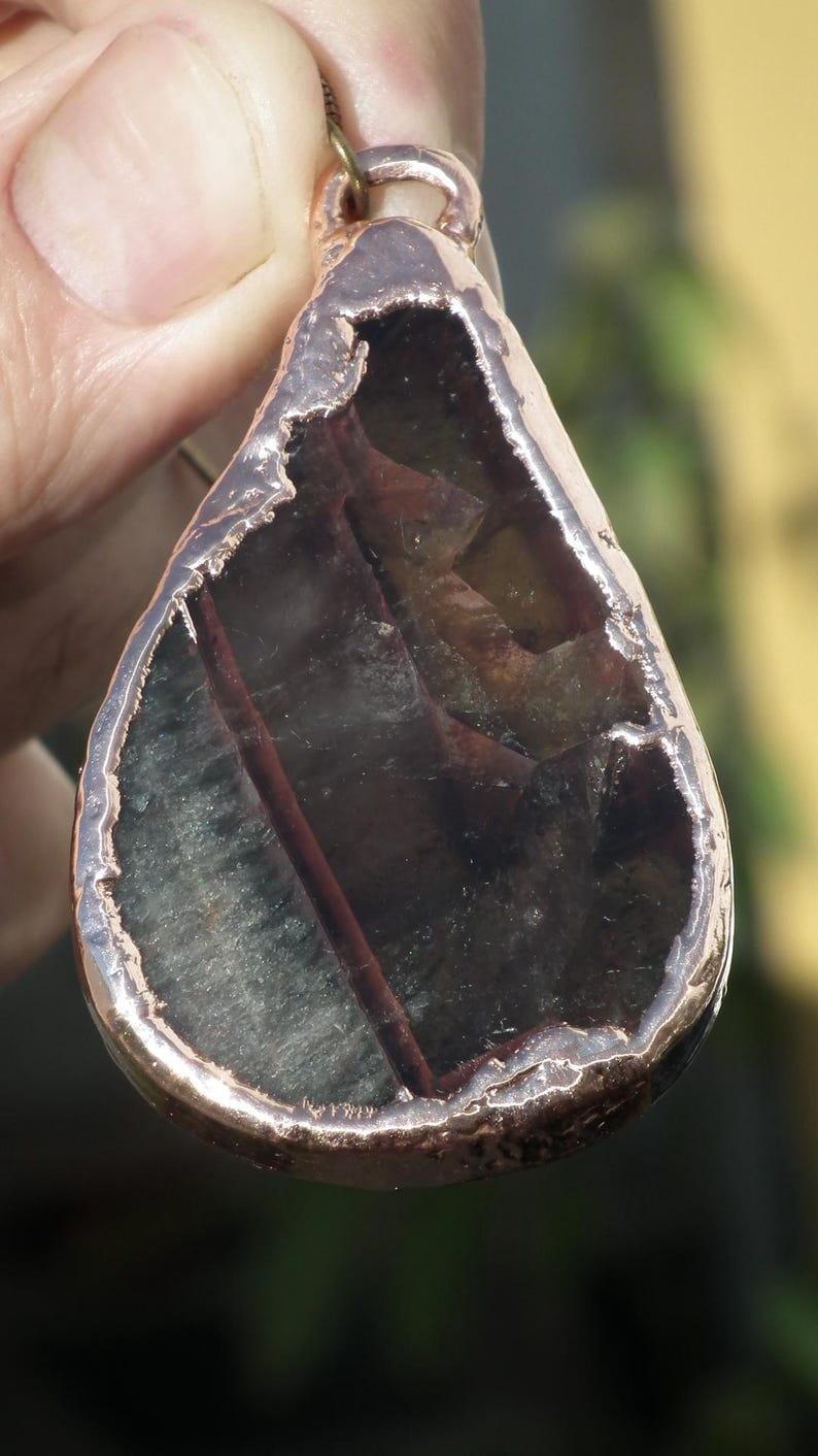 The Electroformed copper Super 7 pendant is one of a kind, the hand cut stone and has a unique pattern, the shiny gold cacoxenite crystals radiate in the amethyst.